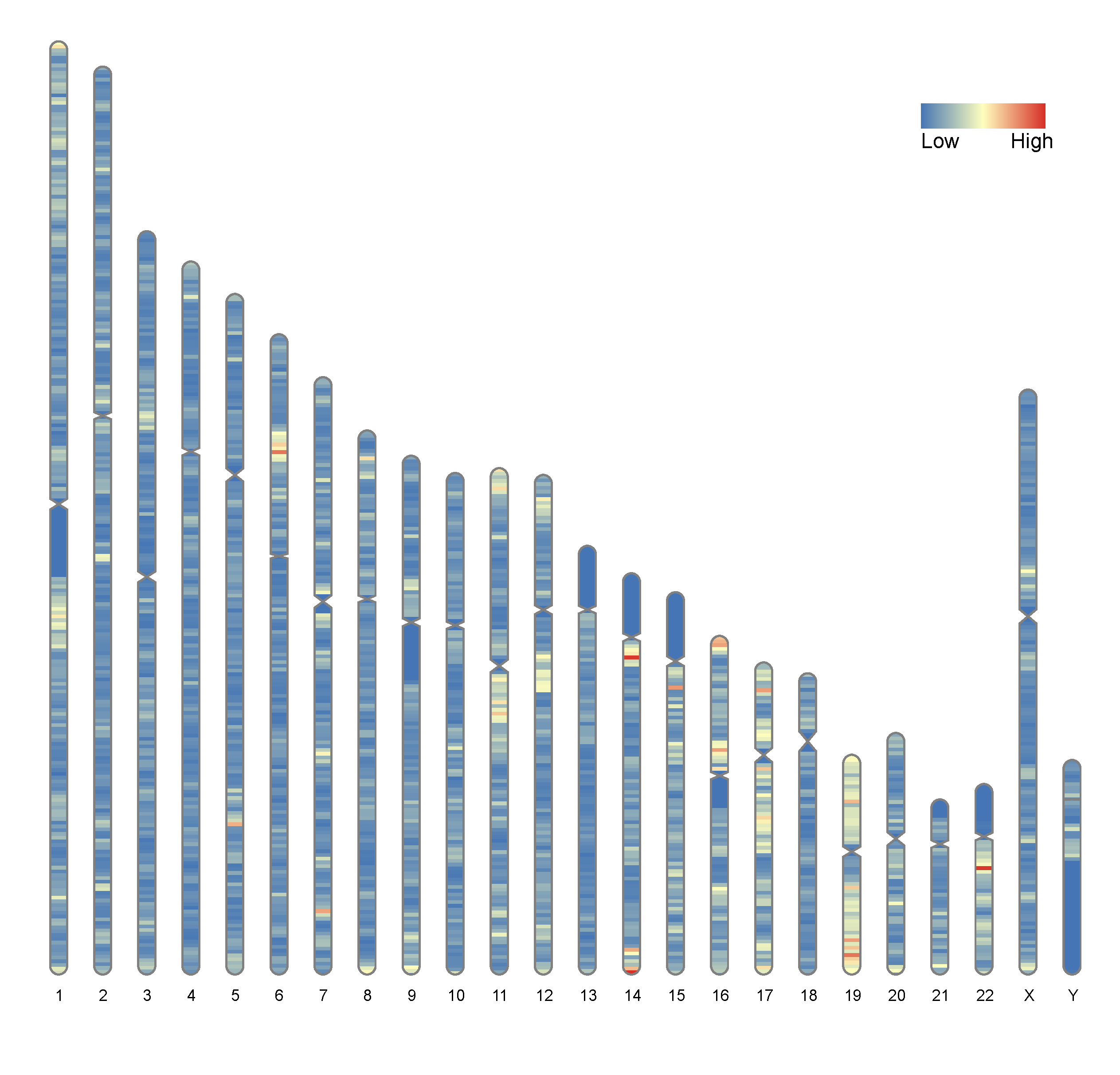 根据染色体数据绘制染色体骨架,然后将密度信息以热图形式叠加上去,同时可以在右侧叠加marker信息,不同类别用不同的形状表示。调用 RIdeogram 包