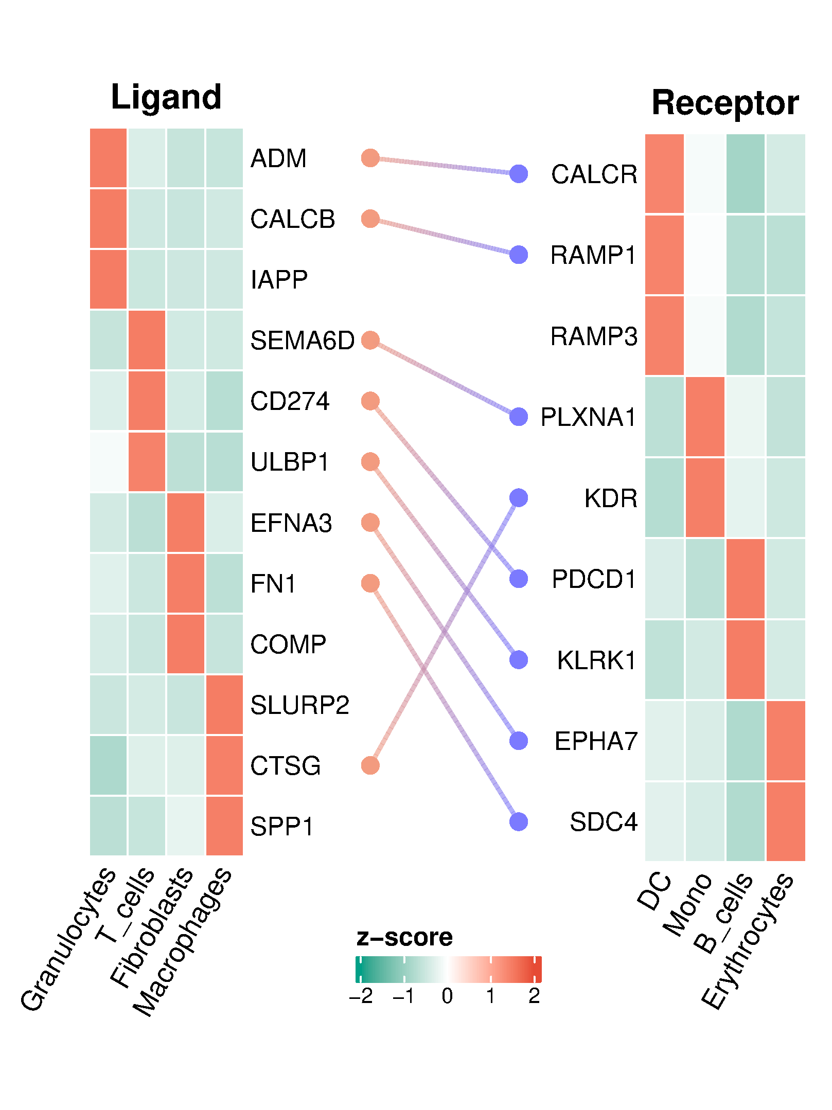使用热图展示受体和配体基因的表达情况,使用连线表示受体-配体对。左侧是配体的热图,行是基因,列是样品(或细胞类型);右侧是受体的热图,行是基因,列是样品(或细胞类型)。 中间以点-线-点的形式展示配体-受体对。